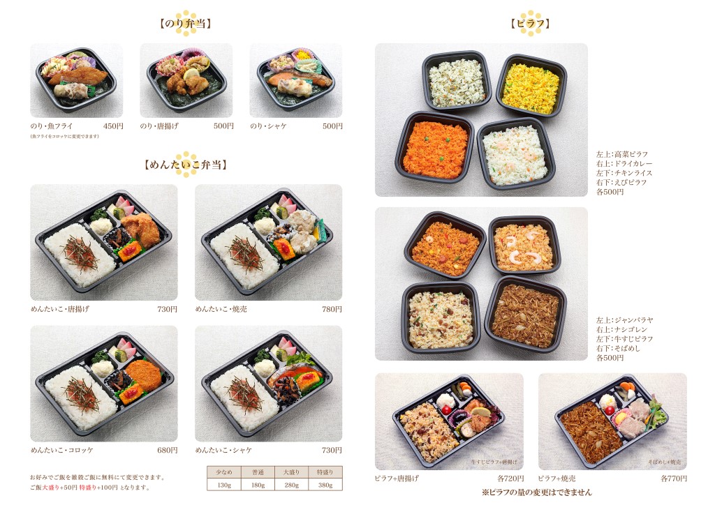 | 備考 | 基本は昼専門ですが、まとまった量でしたら夕方配達もしております。ご相談下さい。 お弁当の内容は、仕入れ状況によって変わります。 |